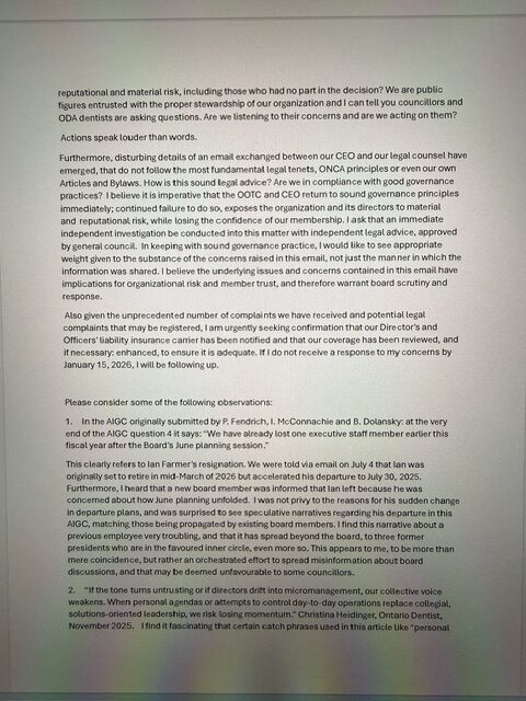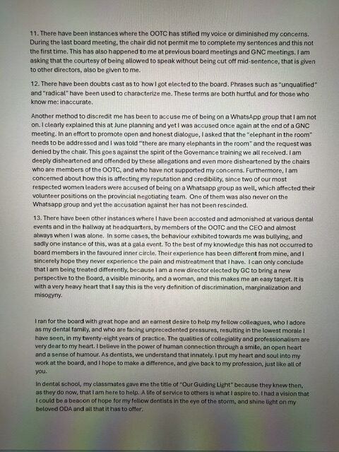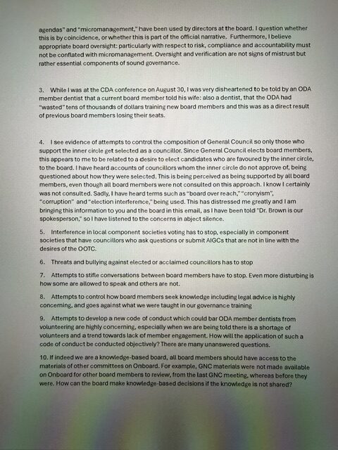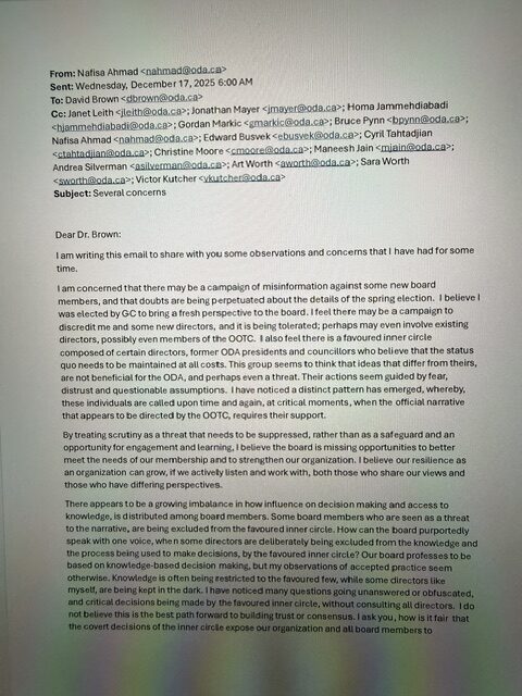 This anonymous tip was sent by an ODA staff whistleblower who is unhappy with how our board operates and treats its new board members.  To all ODA councillors and members please read this letter.  It was a confidential letter sent by one of the newly elected female board members, to ODA President David Brown.  It shows clearly how our current President and our CEO Frank Bevilacqua have breached board confidentiality by sharing this highly personal confidential email with 8 ODA staff.  This is an example of how ODA staff have had access to confidential board discussions and communications.  How many other ODA staffers have had access to such information?  Our president decided to expel one female board member for supposedly “breaching board confidentiality,” yet in the same breath he breaks his own code of conduct.  He is unfit to be president and must resign.  Staffers are tired of being bullied by the ODA CEO, and he must also resign.  This is just one confirmed example of a string of improper actions taken by our current president, CEO and Office of the Chair. ODA members could not and should not accept such behaviour. Members have lost all confidence in this ODA leadership.